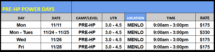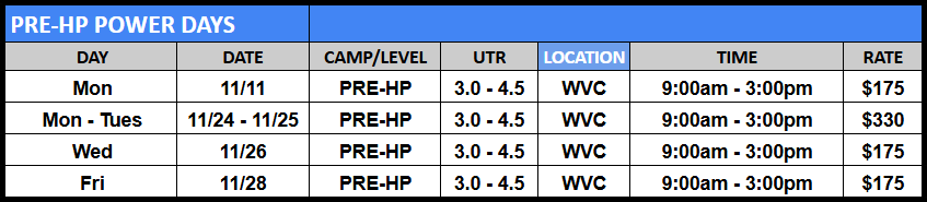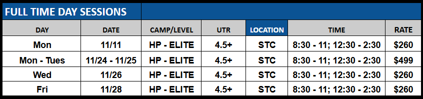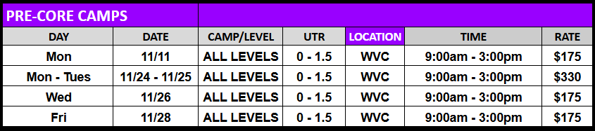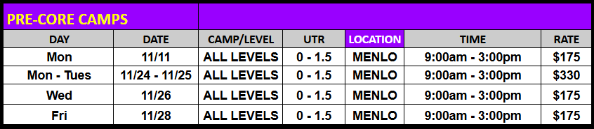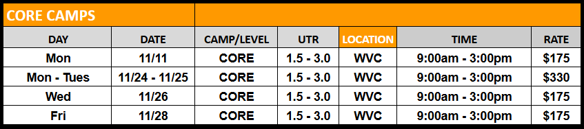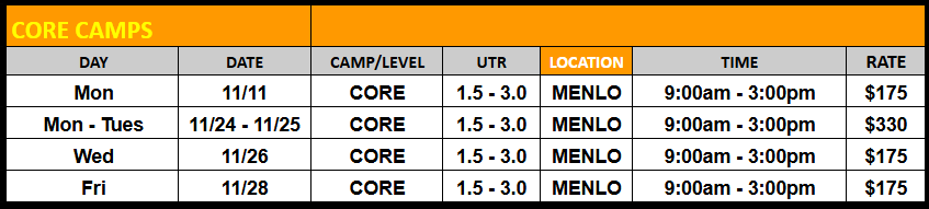 Sharpen your game before the new year! Join our Thanksgiving and Winter Break junior camps—one or two days of fast-paced drilling, serve + return work, and competitive match play. Same great coaching, flexible format. Grab a single day for a quick tune-up or stack more days for maximum gains. Veterans Day and Thanksgiving schedules are below, Winter Break schedules coming soon!