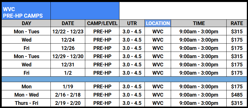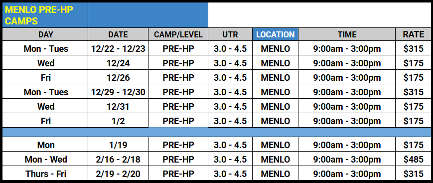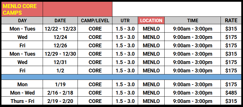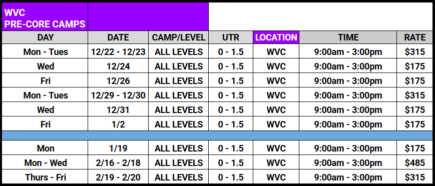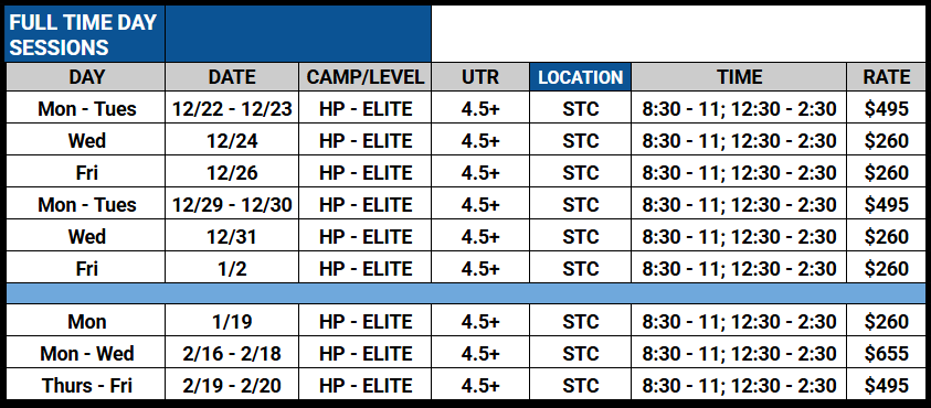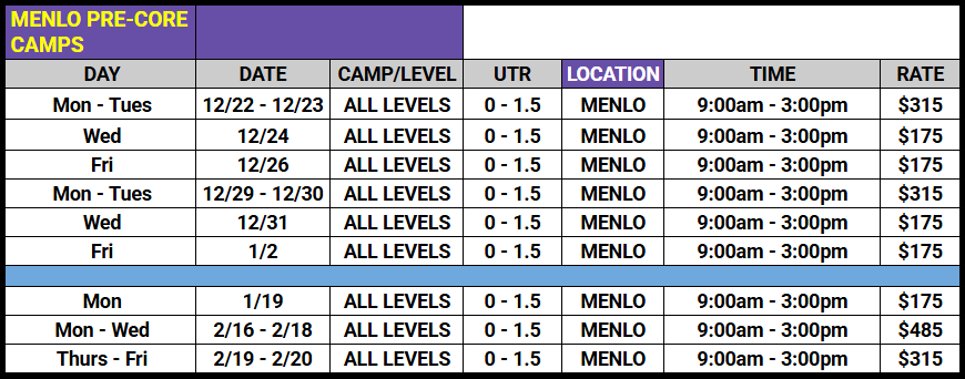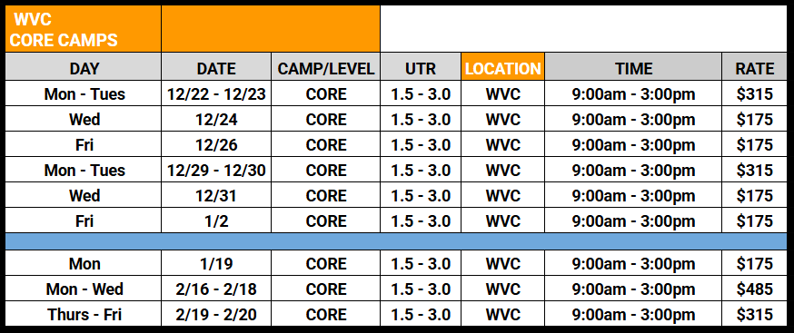 Online Registration Through Active (see links below)Sharpen your game before the new year! Join our Winter Break junior camps—one or two days of fast-paced drilling, serve + return work, and competitive match play. Same great coaching, flexible format. Grab a single day for a quick tune-up or stack more days for maximum gains.