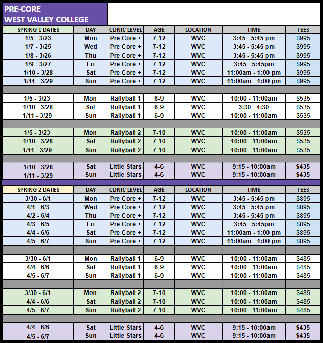 Pre Core Plus (Ages 7-11). For players who have advanced from Rallyball II or have had similar prior instruction. This session is the bridge between our Pre-Core and Core programs. Players must be approved by the coaching staff to join the Pre-Core Plus program. The program will work on athletic development, proper fundamental technique, footwork development, continental grip skills, point play/strategies, and character development. Players will receive a lot of quality touches on the ball. Depending on the skills that the players are working on, we will use a combination of Orange, Green, and mostly Yellow ball in this program. This program is perfect for players who have already competed in ROG tournaments or are planning to compete in ROG tournaments. Classes are 2 hours long. Players must be able to handle a longer workload.