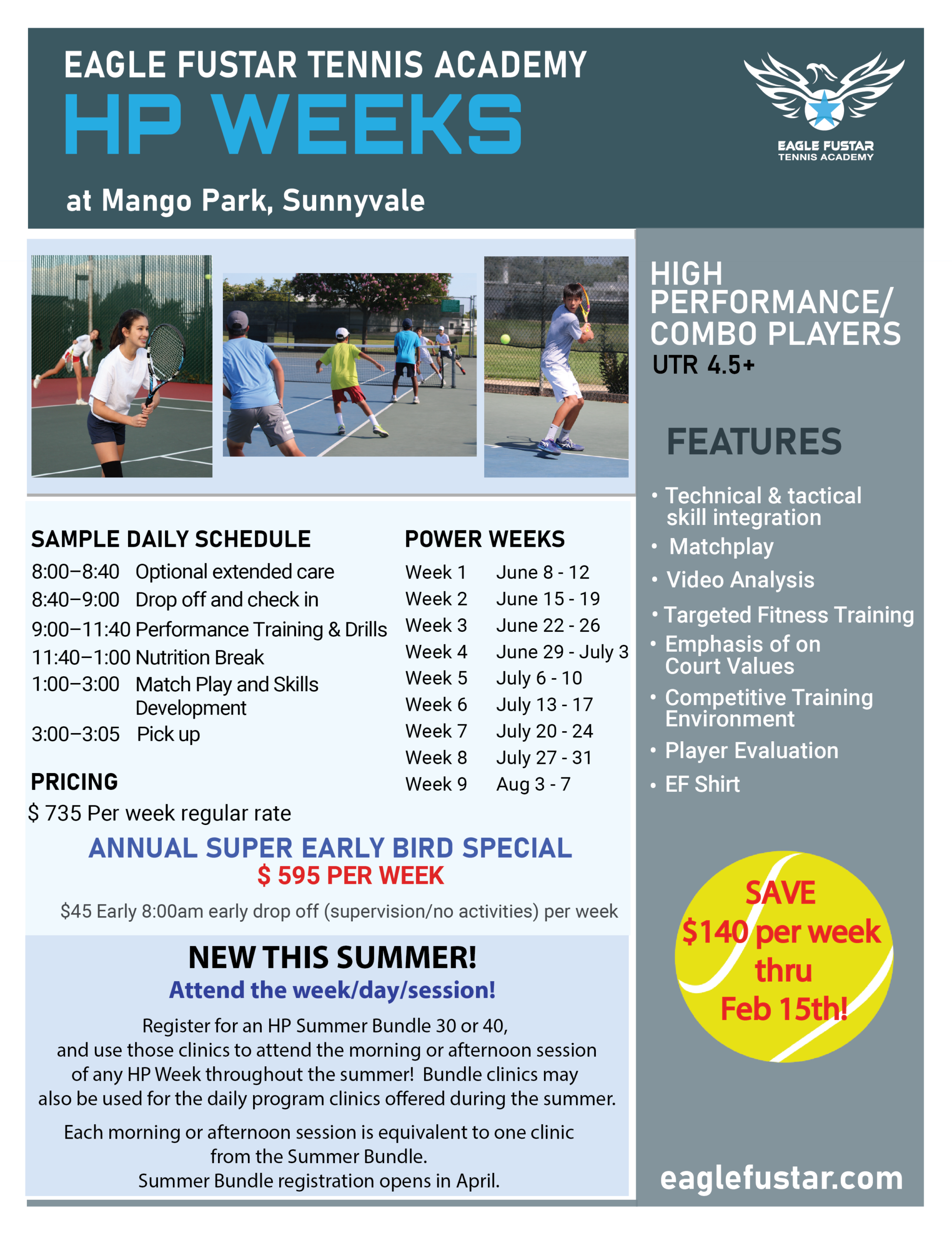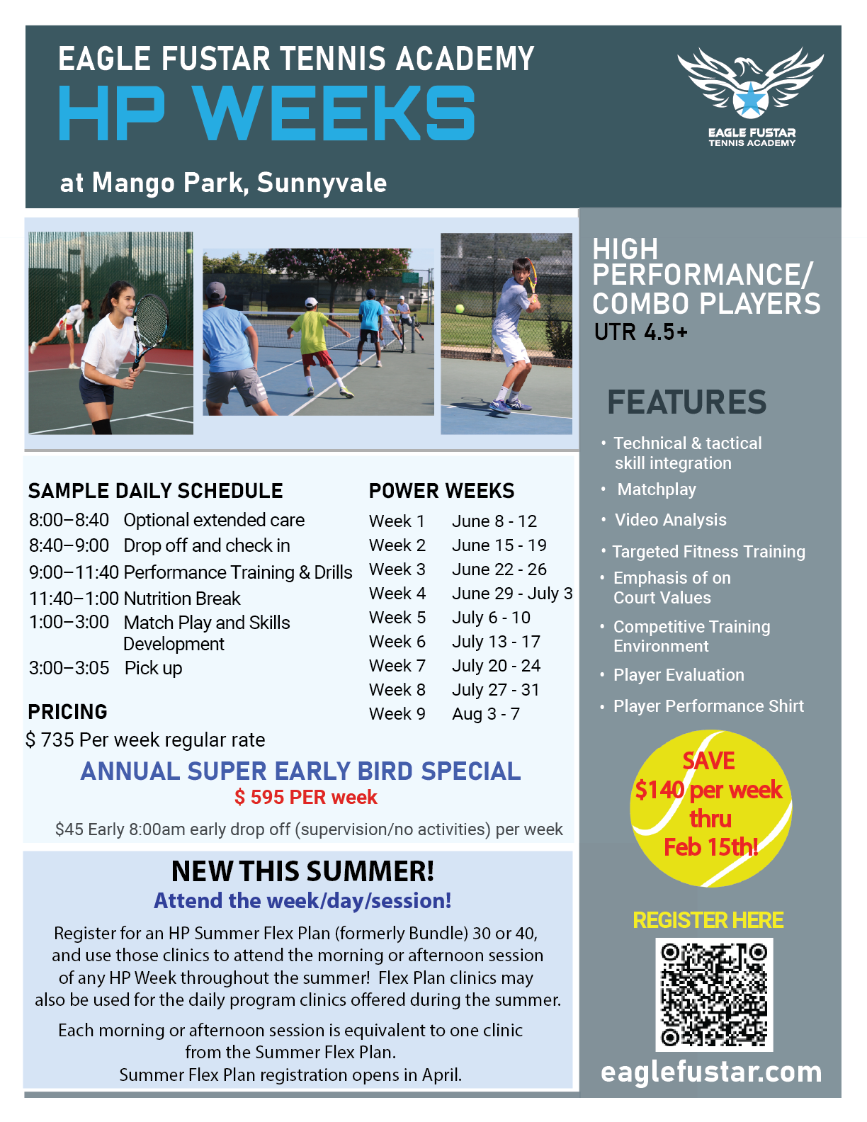 HP & HP+ Weeks at Mango Park are designed to give players rigorous collegiate-style training in a competitive, yet supportive, all-day training environment. Players will work on tennis skills, physical conditioning, mental skills, and tactical work. On court core values are reinforced through positive habit building, particularly during match play.