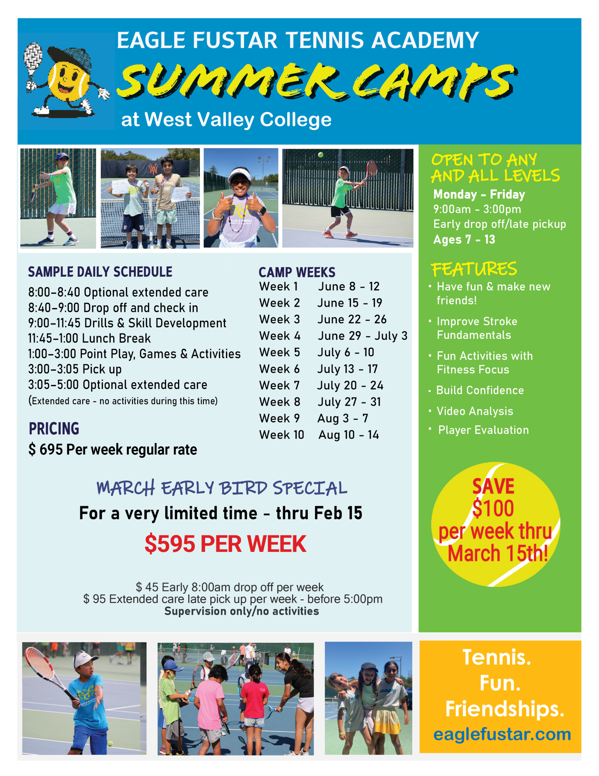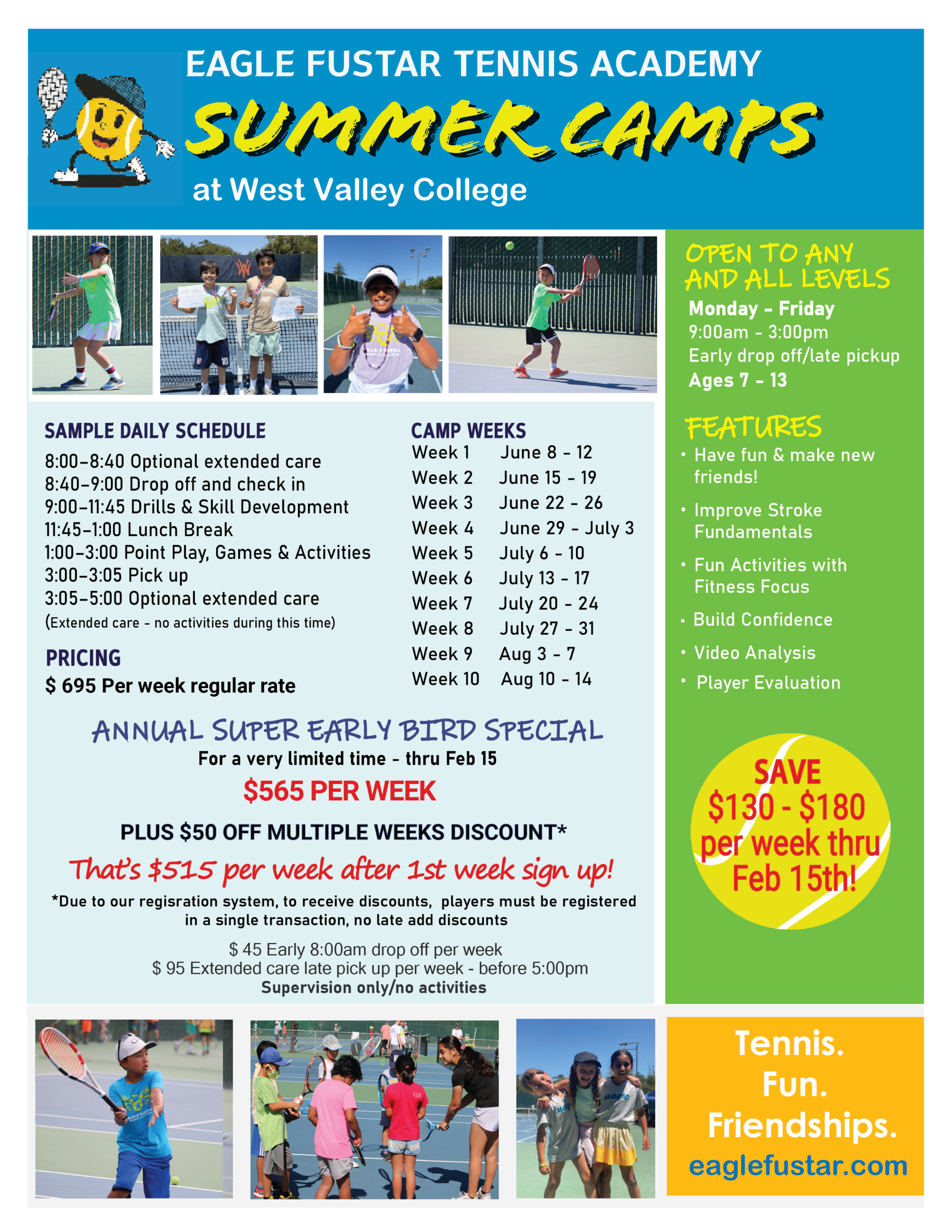 Summer Camps deliver serious instruction with lots of fun to help players improve their game, work hard and make new friends, all while having a blast playing tennis. Instruction is set in a supportive and active learning environment that emphasizes development of a player’s core values of success.  Players will receive quality instruction, play matches, and even win prizes! Campers can expect to improve skills and end the week with a greater love for tennis than when they first arrived!